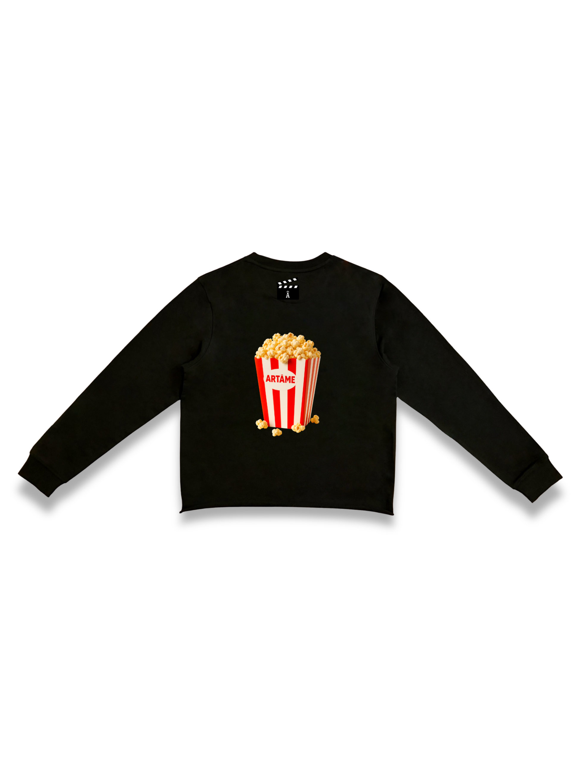 Sweat-Shirt à manches longues noir avec un imprimé sur l'arrière du vêtement.