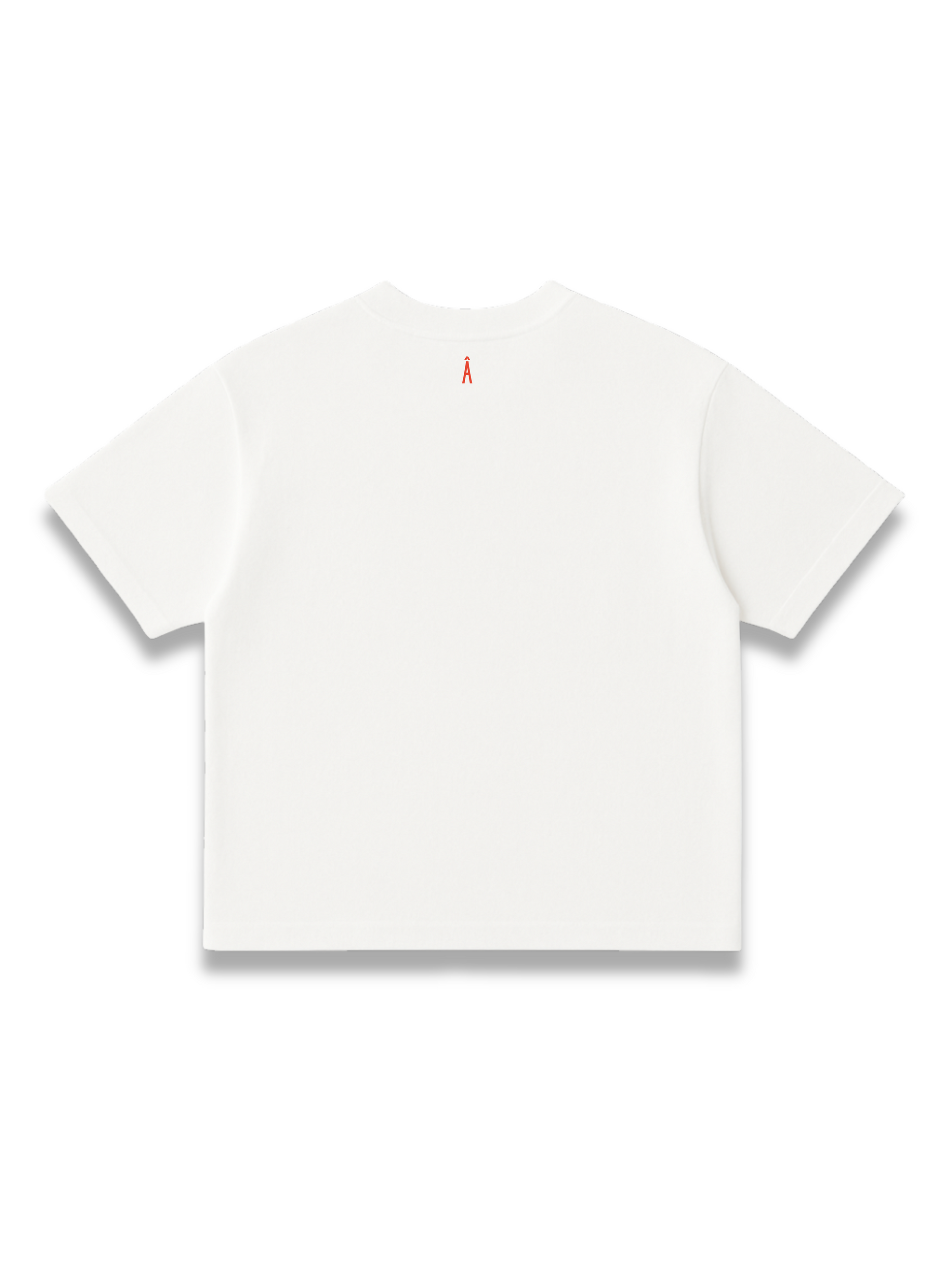 T-shirt à manches coutes blanc avec un imprimé sur l'avant du vêtement.