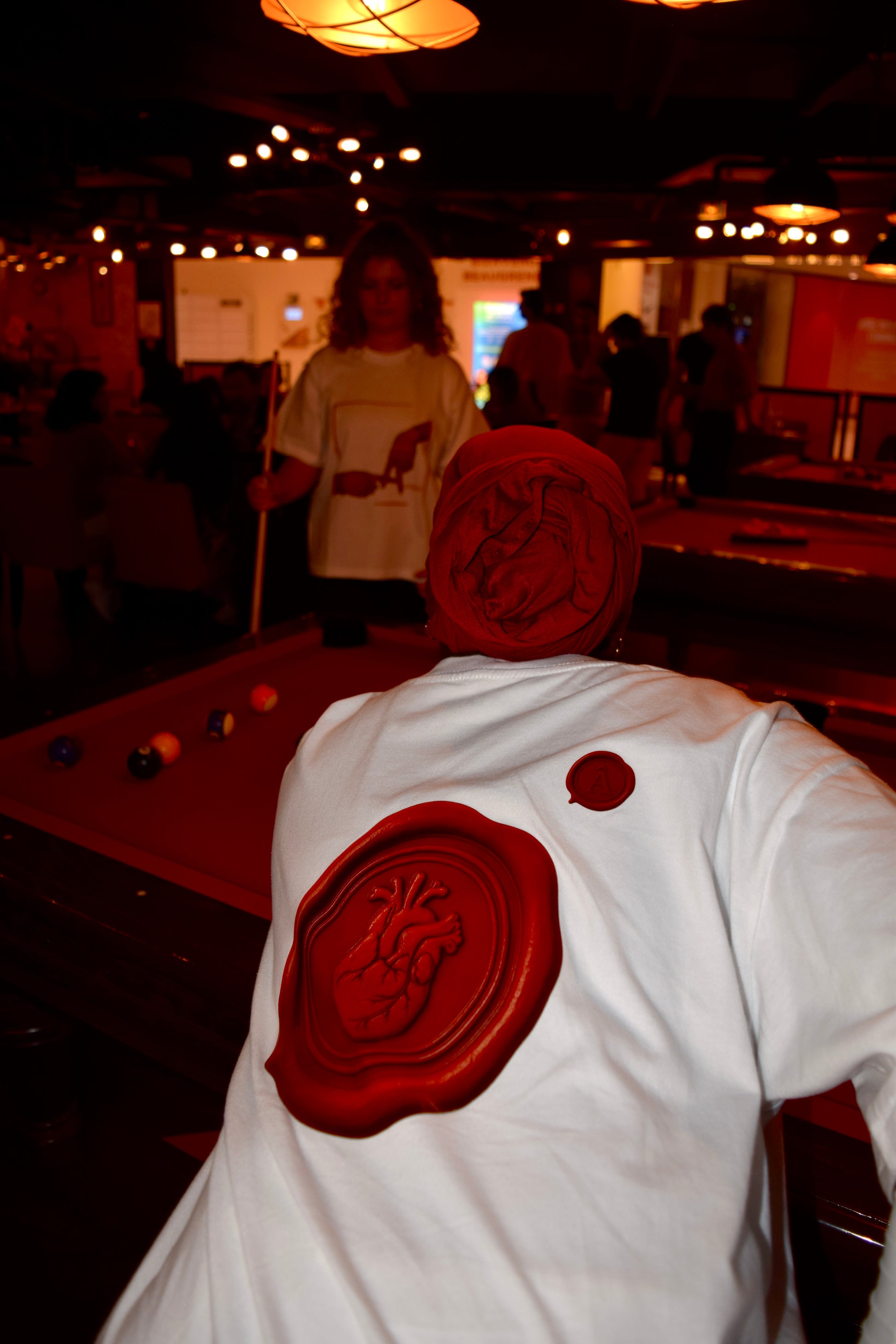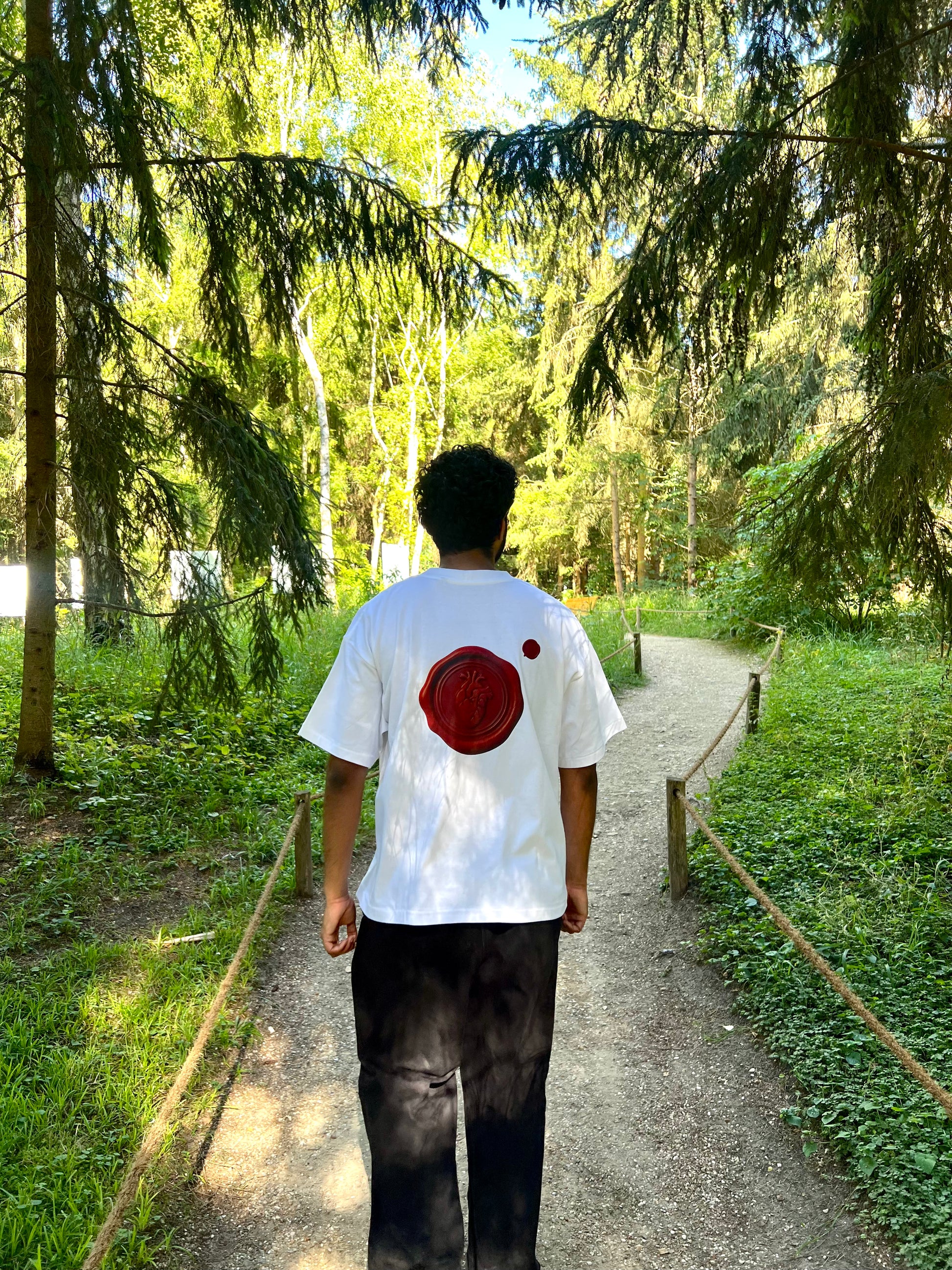 T-shirt à manches coutes blanc avec un imprimé à l'arrière du vêtement.