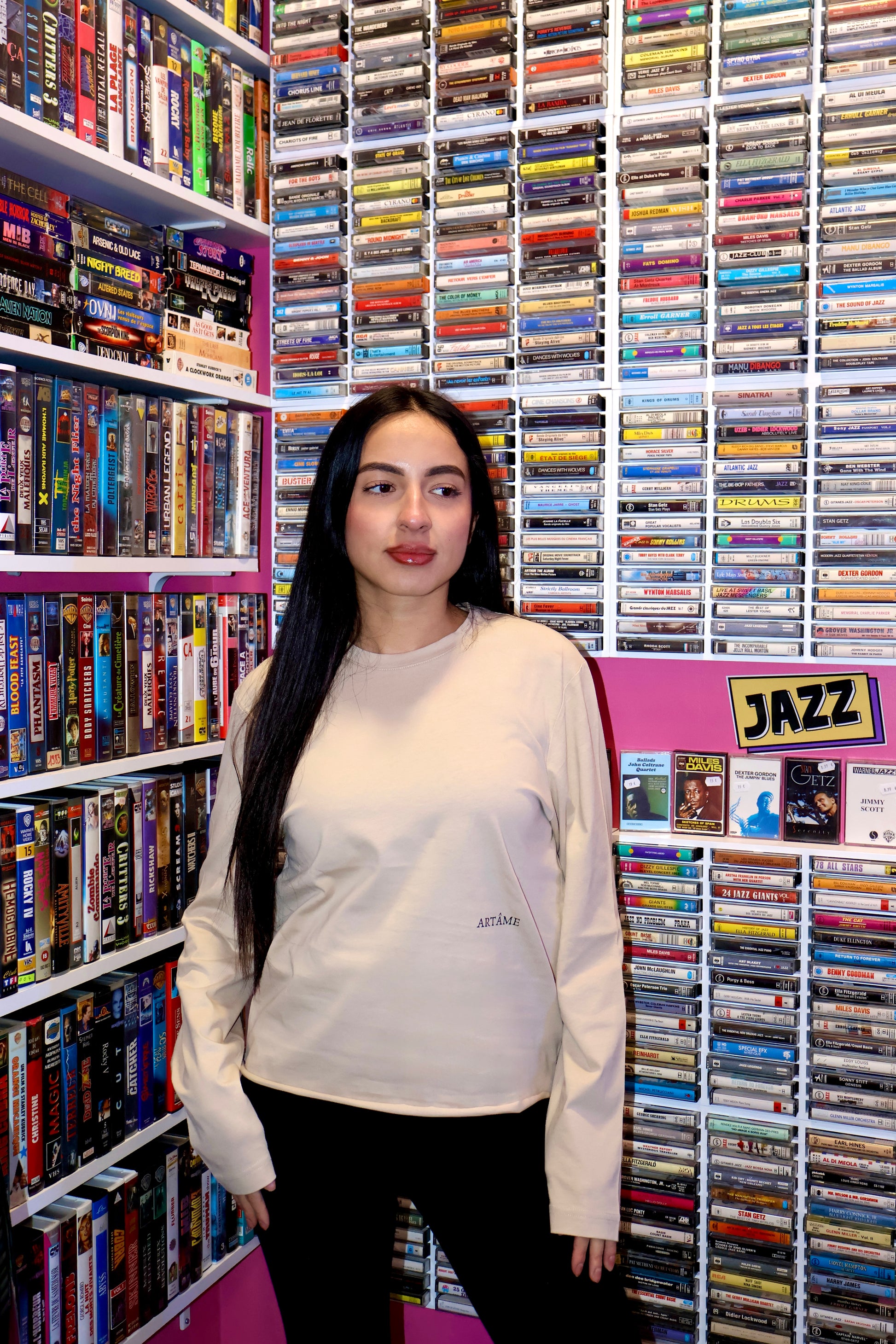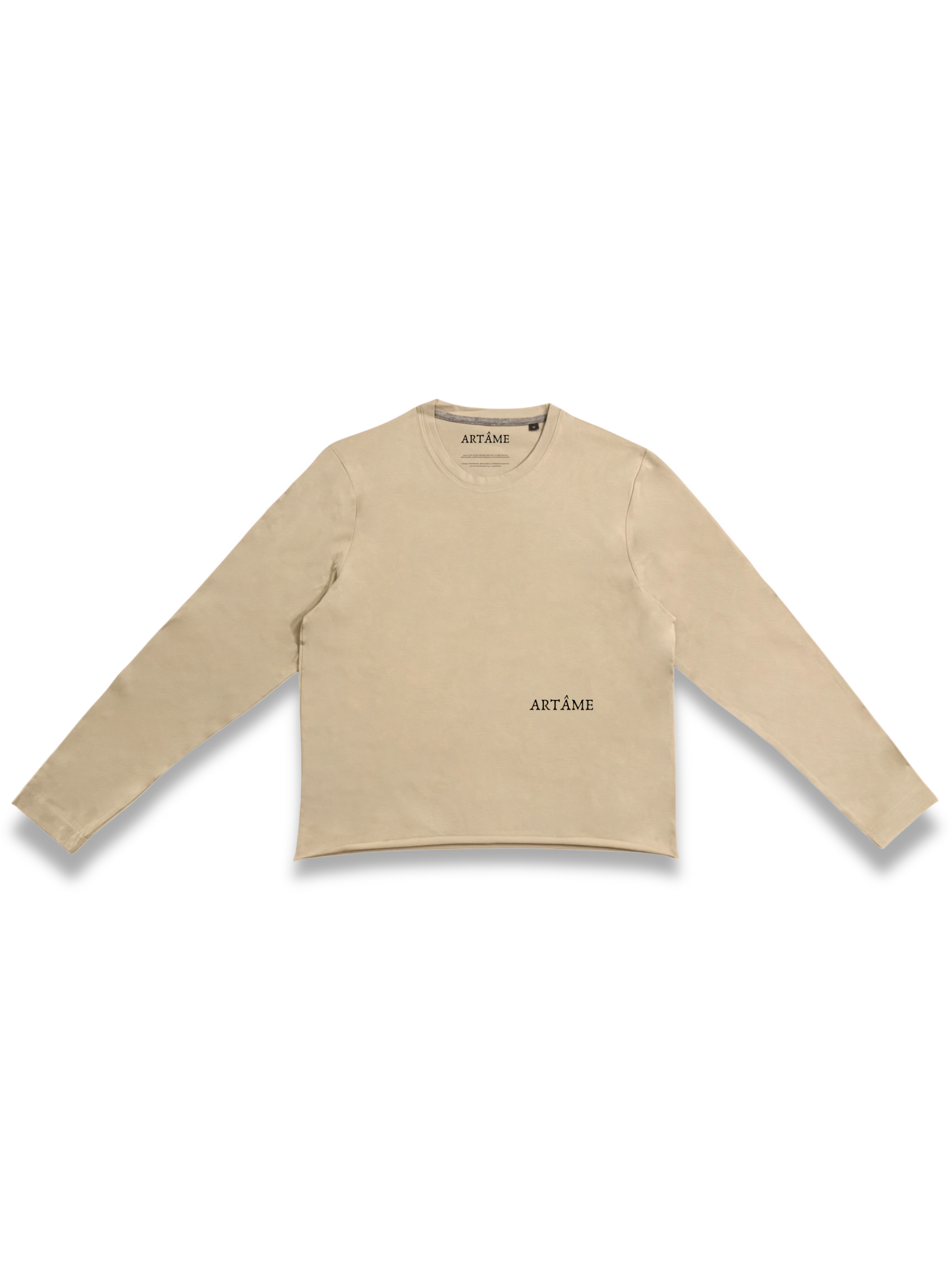 T-shirt à manches longues beige avec un imprimé sur l'arrière du vêtement.