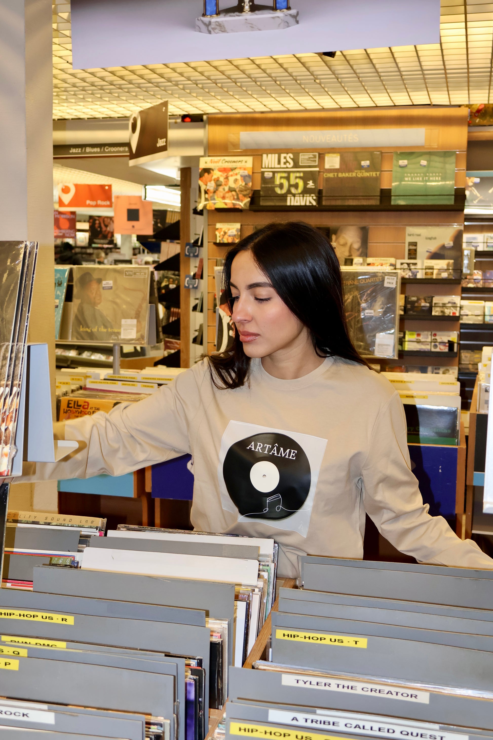 T-shirt à manches longues beige avec un imprimé sur l'avent et l'arrière du vêtement.